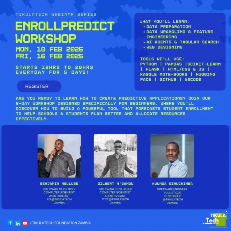 Join the *EnrollPredict* Workshop by *TikulaTech Foundation Zambia* and learn how AI can revolutionize enrollment processes. This hands-on session will equip you with the knowledge and skills to develop smarter, more efficient AI solutions.This project aims to achieve two key deliverables: