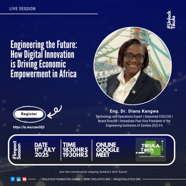 Join us on Friday, 11th July 2025 for an inspiring session with Eng. Dr. Diana Kangwa, a technology and operations expert transforming Africa’s digital future. Let’s discover how technology and innovation can unlock real economic opportunities for Zambia’s youth and beyond.